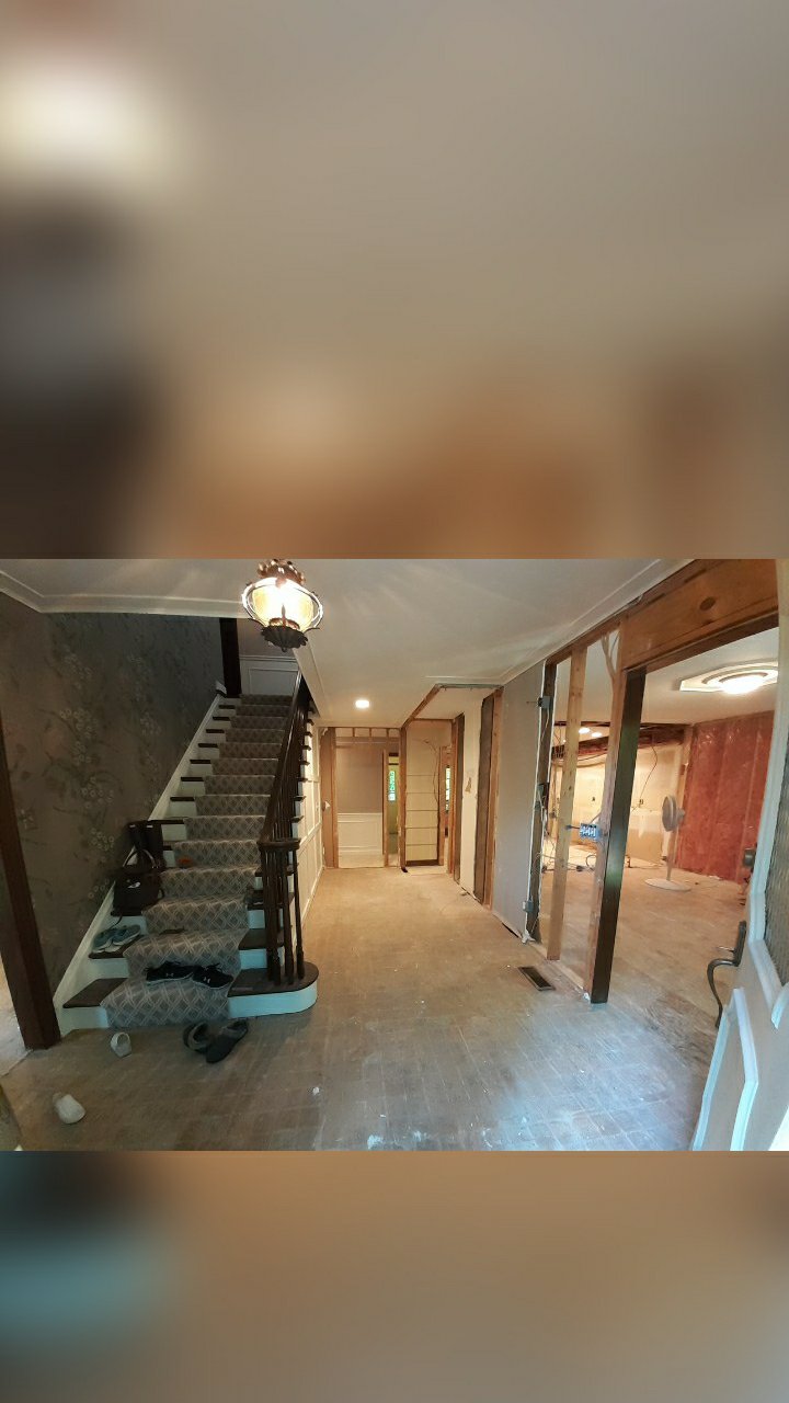 The yellow floor tiles in the foyer have been taken up. The coat closet is gone. The foyer wall is still up since it’s load bearing. We need to wait on a special beam before it comes down.