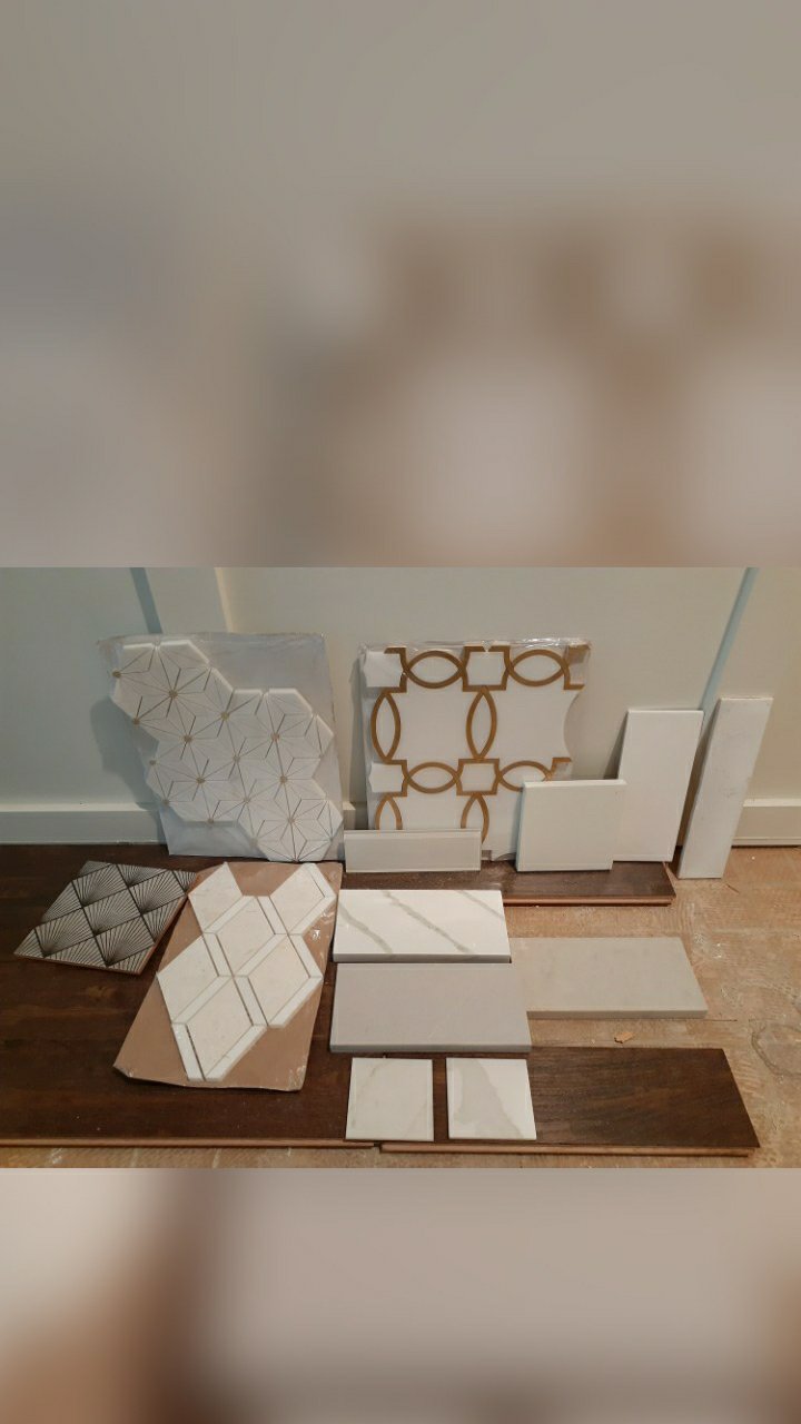 The designer dropped off these samples while I was at work today. I need to pick a quartz counter, subway tile for herringbone backsplash and a decorative tile for a statement backsplash to use over our floating shelf buffet.