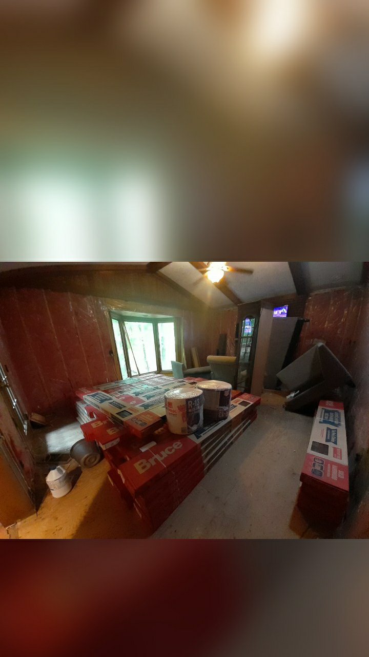 Day 4 demo ended with family room and dinning room floors being pulled up. The small kitchen pantry got removed as well. We are able to start to see our staircase from the family room for the first time.